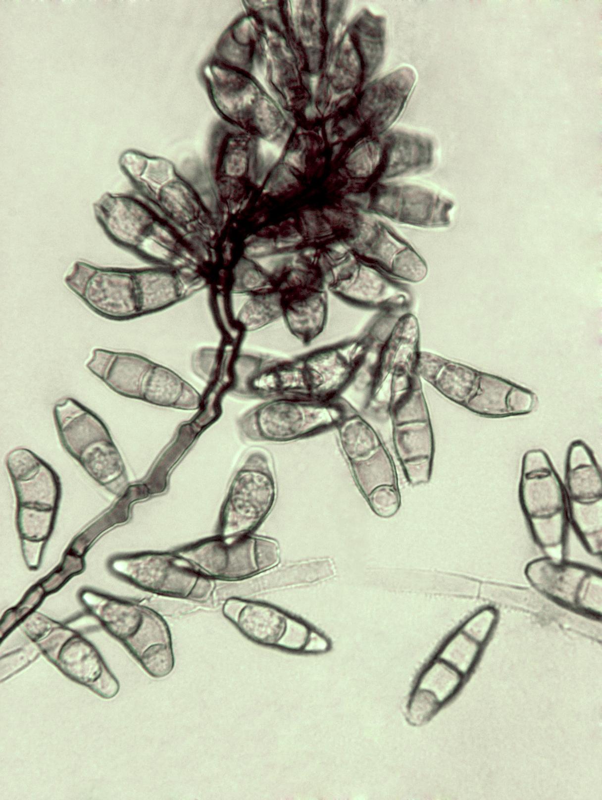 Légende: Conidies et conidiophore de Curvularia sp.