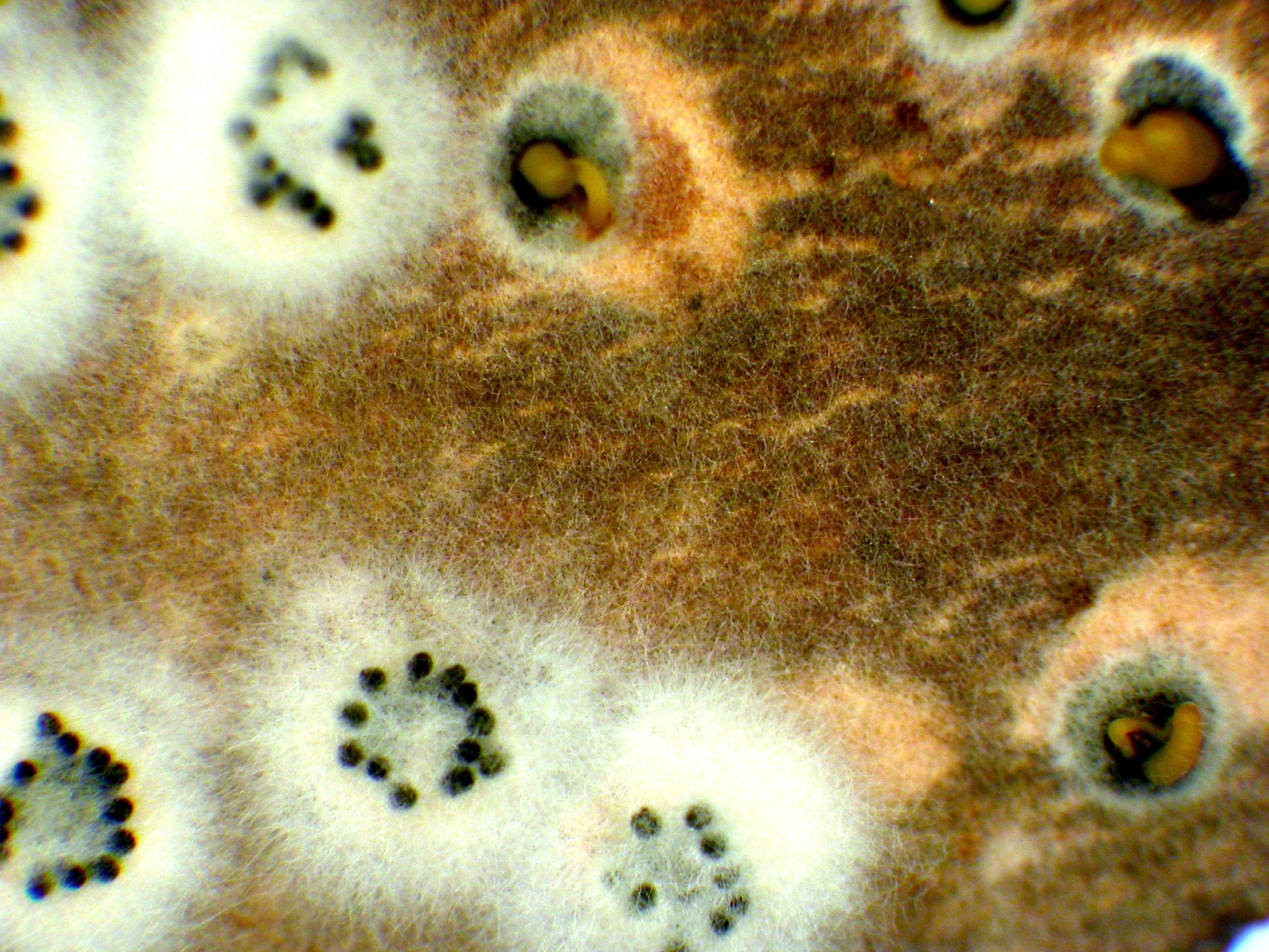: Pycnides noires de Cytospora sp. et cirrhes orangés (Stéréomicroscope)