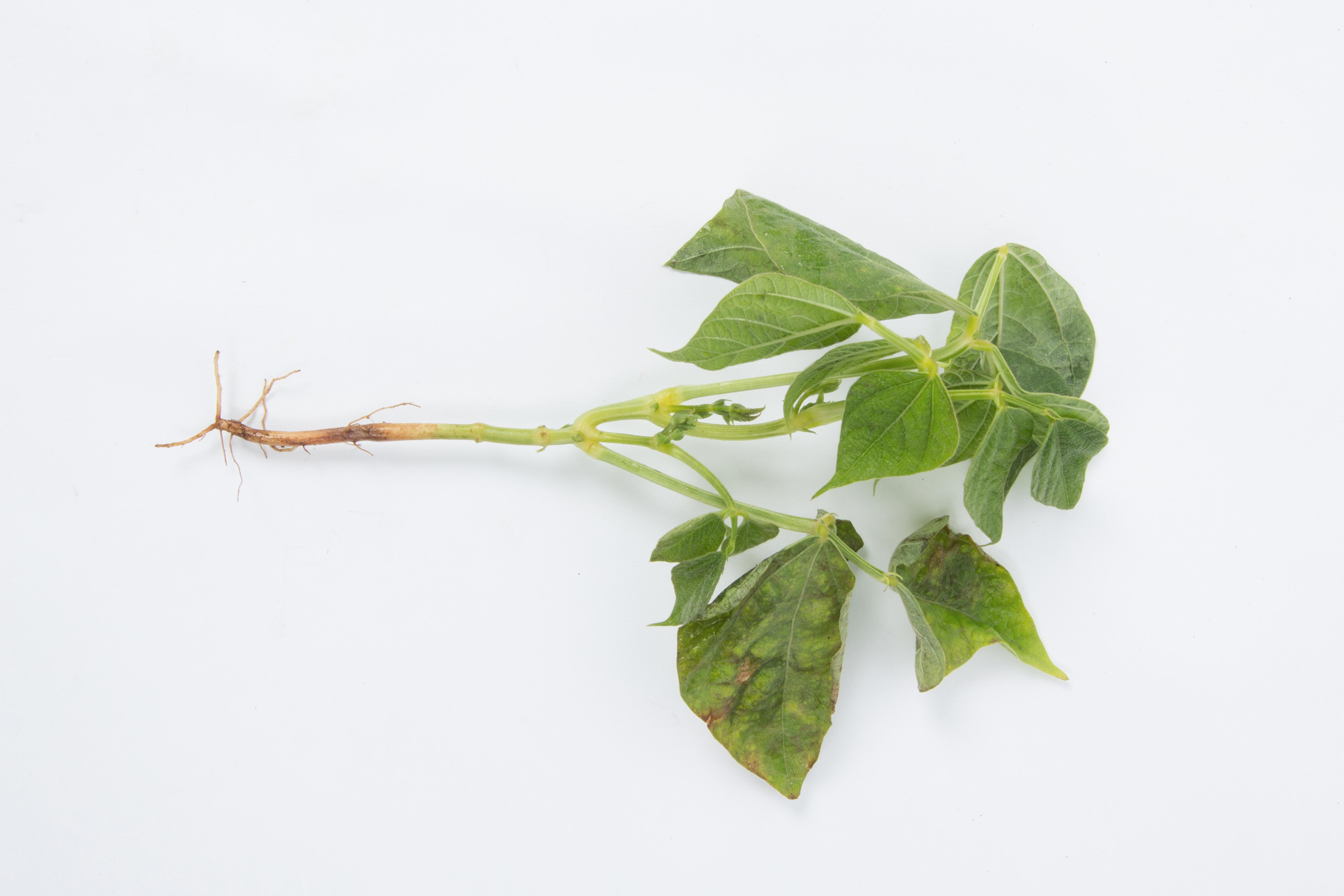 Description: Un plant de haricot montre des taches à contour diffus, beiges avec une marge brune, à la face supérieure des feuilles basales et médianes. Un halo jaune est parfois présent. Les taches sont surtout localisées à la marge. Les feuilles portant des taches sont aussi finement ponctuées et jaunies. Les taches sont moins visibles sur la face inférieure des feuilles. Les tests de laboratoire ont révélé la présence de la bactérie Pseudomonas syringae. Il s’agit probablement de P. s. pv. syringae, responsable de la graisse bactérienne (tache brune bactérienne) chez le haricot puisque les taches ne débutent pas à la face inférieure.