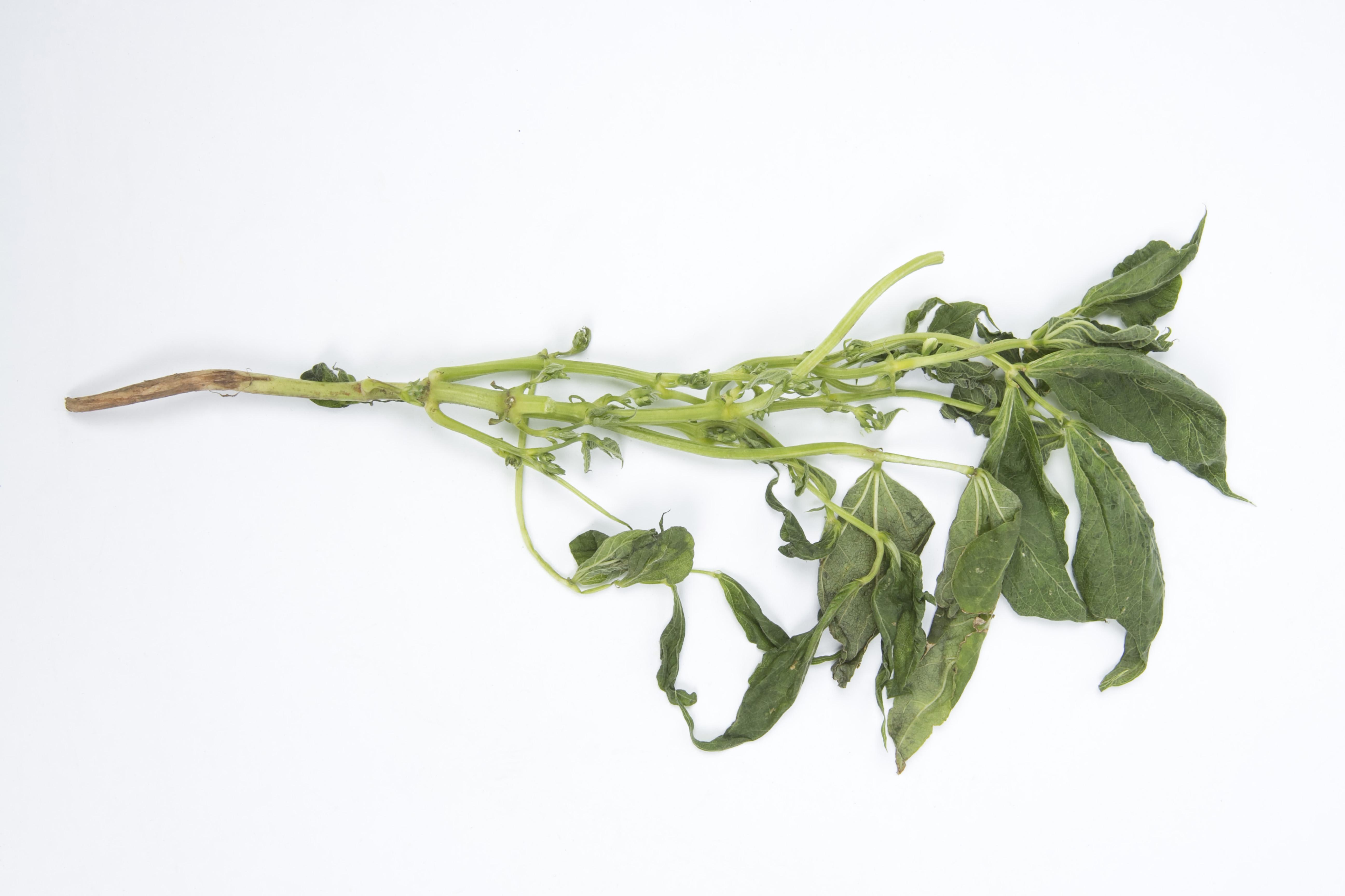 Description: Des folioles de haricot sont déformées. Elles montrent du bossellement, une marbrure du limbe allant du vert foncé au vert pâle, les nervures sont déformées et la marge peut être courbée vers le haut. Les jeunes feuilles sont les plus affectées. Les tests de laboratoire ont révélé la présence du virus de la mosaïque du concombre (CMV).
