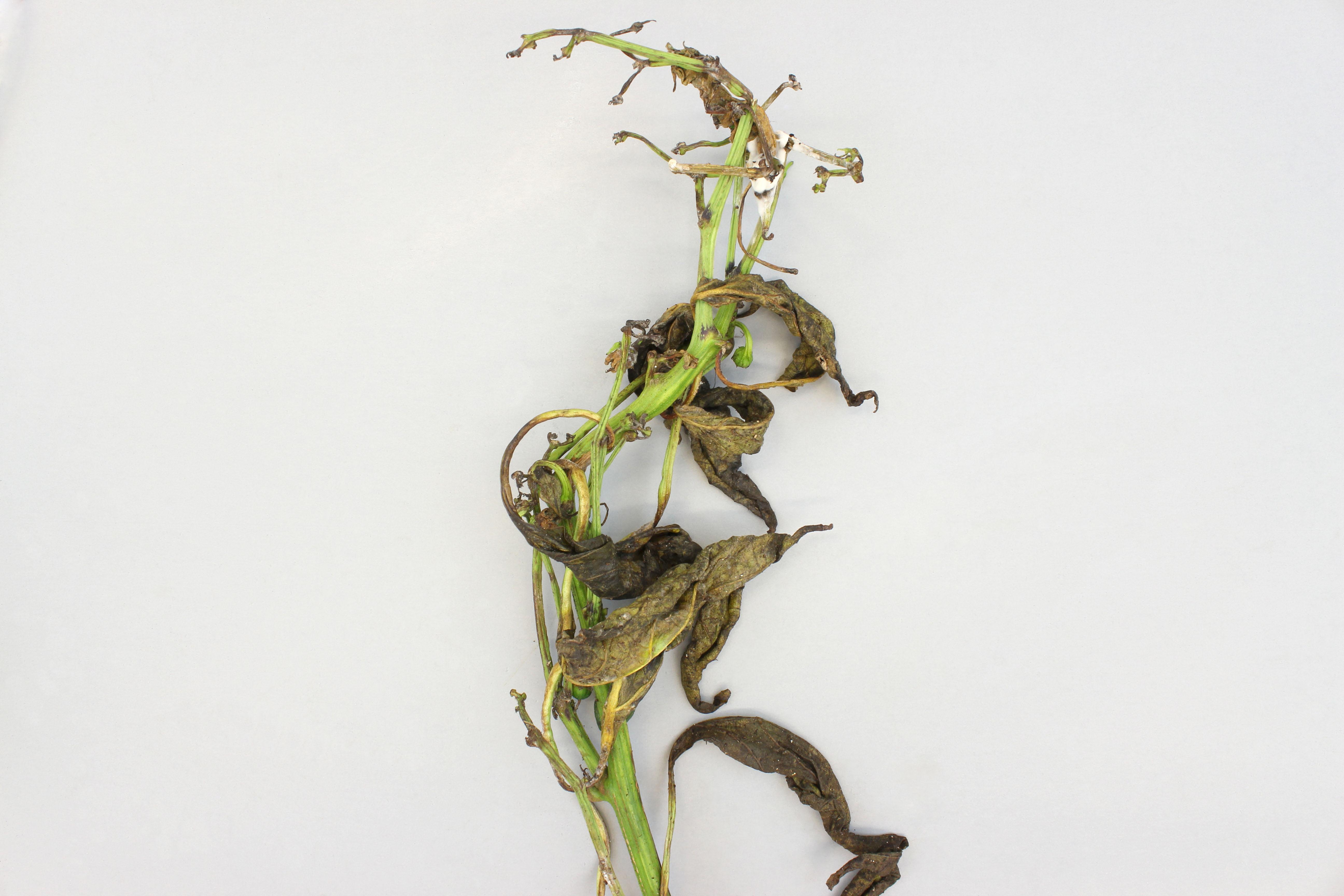 Description: L’extrémité des tiges d’un plant de poivron de champ montre des zones de pourriture dans lesquelles les tissus sont bruns. Un mycélium blanc est présent dans les zones de pourriture. Le pétiole des feuilles est également affecté. Les feuilles sont complètement dépéries. Les tests de laboratoire ont révélé la présence du champignon Sclerotinia sclerotiorum, responsable de la pourriture sclérotique (sclérotiniose).