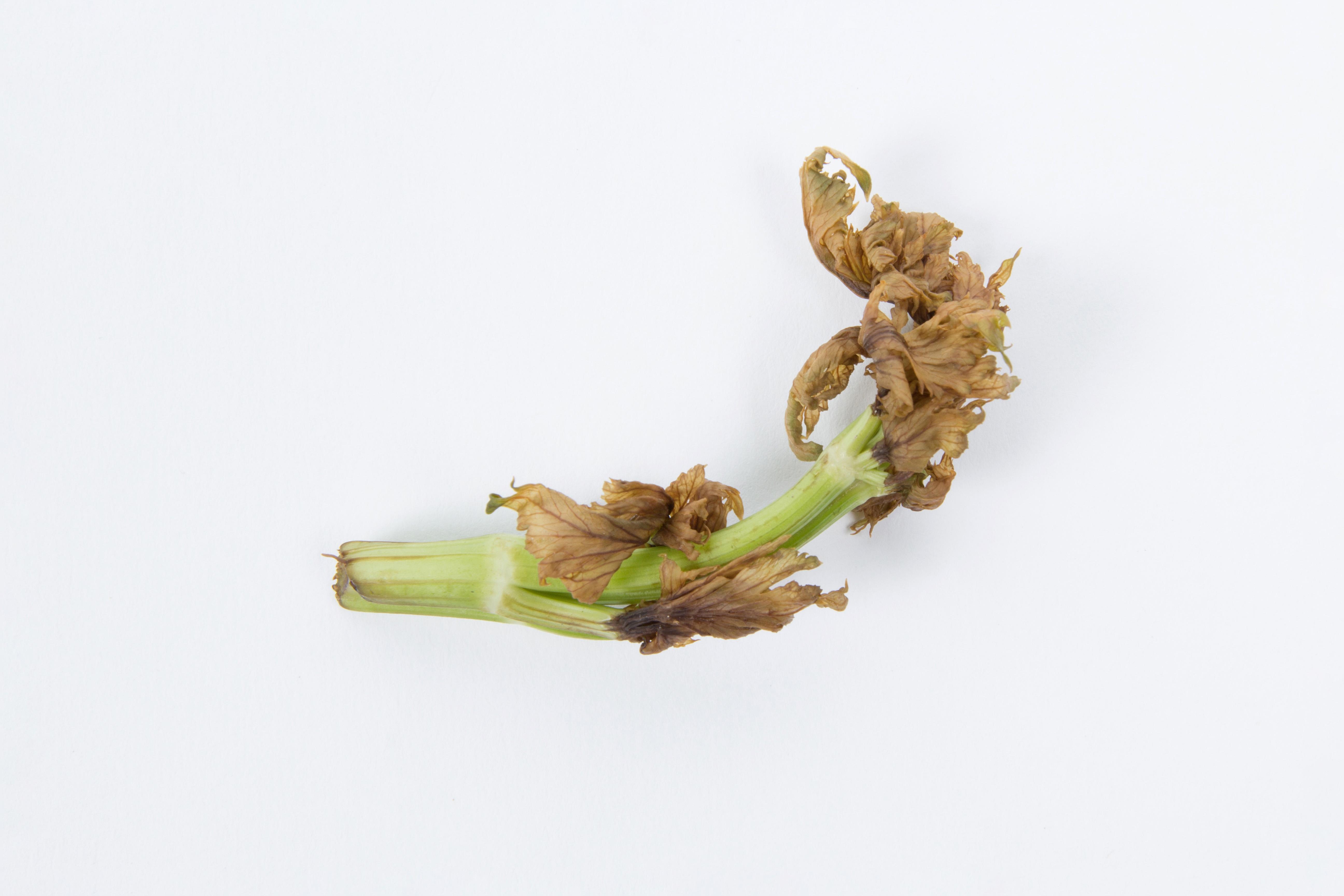 Description: Un morceau de pétiole de céleri provenant du cœur des plants montre une coloration brun-noir de l’extrémité des jeunes feuilles. Une délimitation nette sépare les tissus affectés des tissus d'apparence saine. Le pétiole est un peu tordu. Les tests de laboratoire se sont avérés négatifs pour la détection de champignon et de bactérie. Les dommages s’apparentent à ceux du cœur noir induit par une carence en calcium.