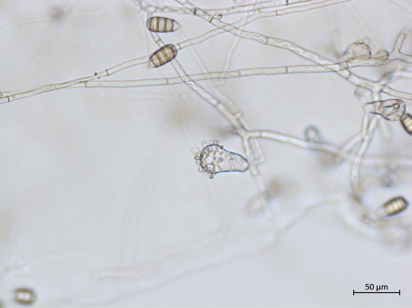 Légende: Conidiophore de Cephaliophora tropica portant plusieurs conidies immatures.