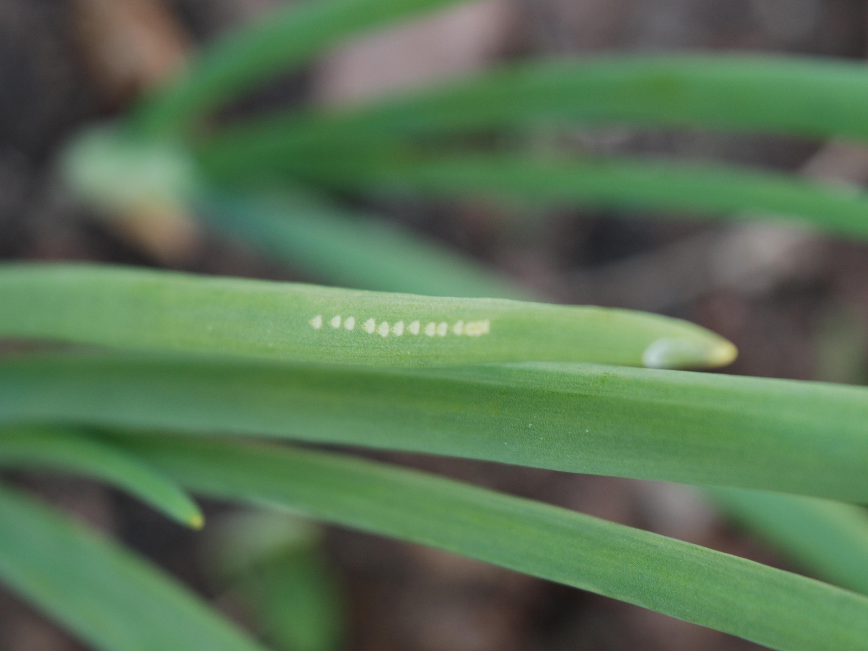 Légende: Dommage de Phytomyza gymnostoma sur le feuillage d'un jeune poireau